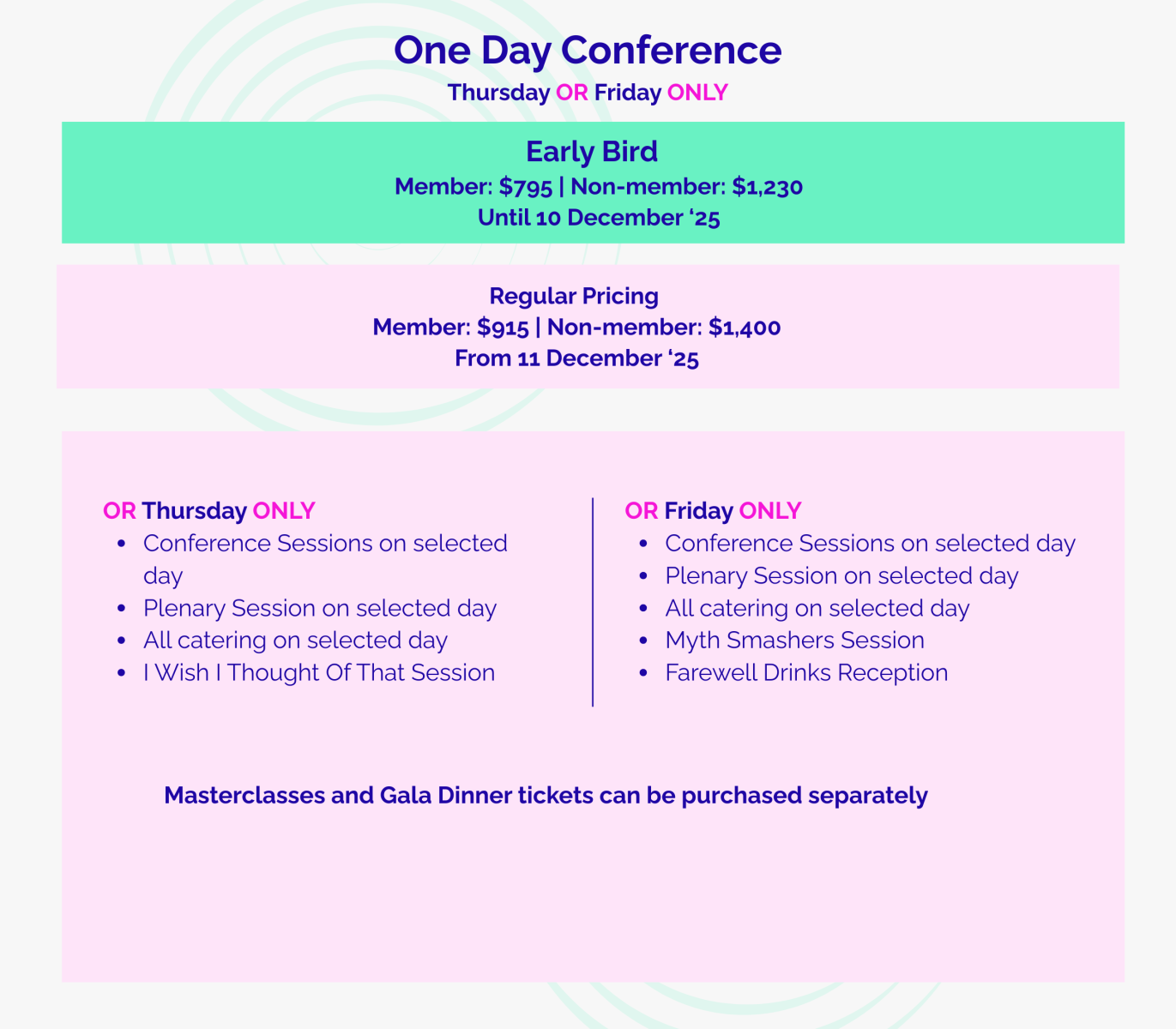 A number of pre-conference masterclasses will run on Wednesday 25 February. Limited numbers apply and will be filled on a first come first served basis. Delegates can select one masterclass only. Pre-Conference Masterclass registration inclusions: